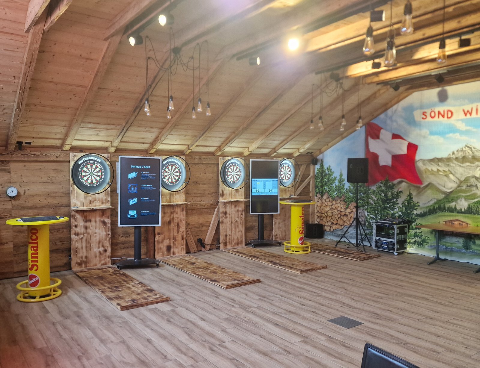 Der Steeldart-Bereich ist in modernem rustikalem Stil gehalten mit moderner Hard- und Software kann die Spielführung einfach gehalten werden. Im E-Dartbereich sind ebenfalls 2 Steeldartscheiben zur Verfügung um jederzeit ein par Pfeile zu werfen.