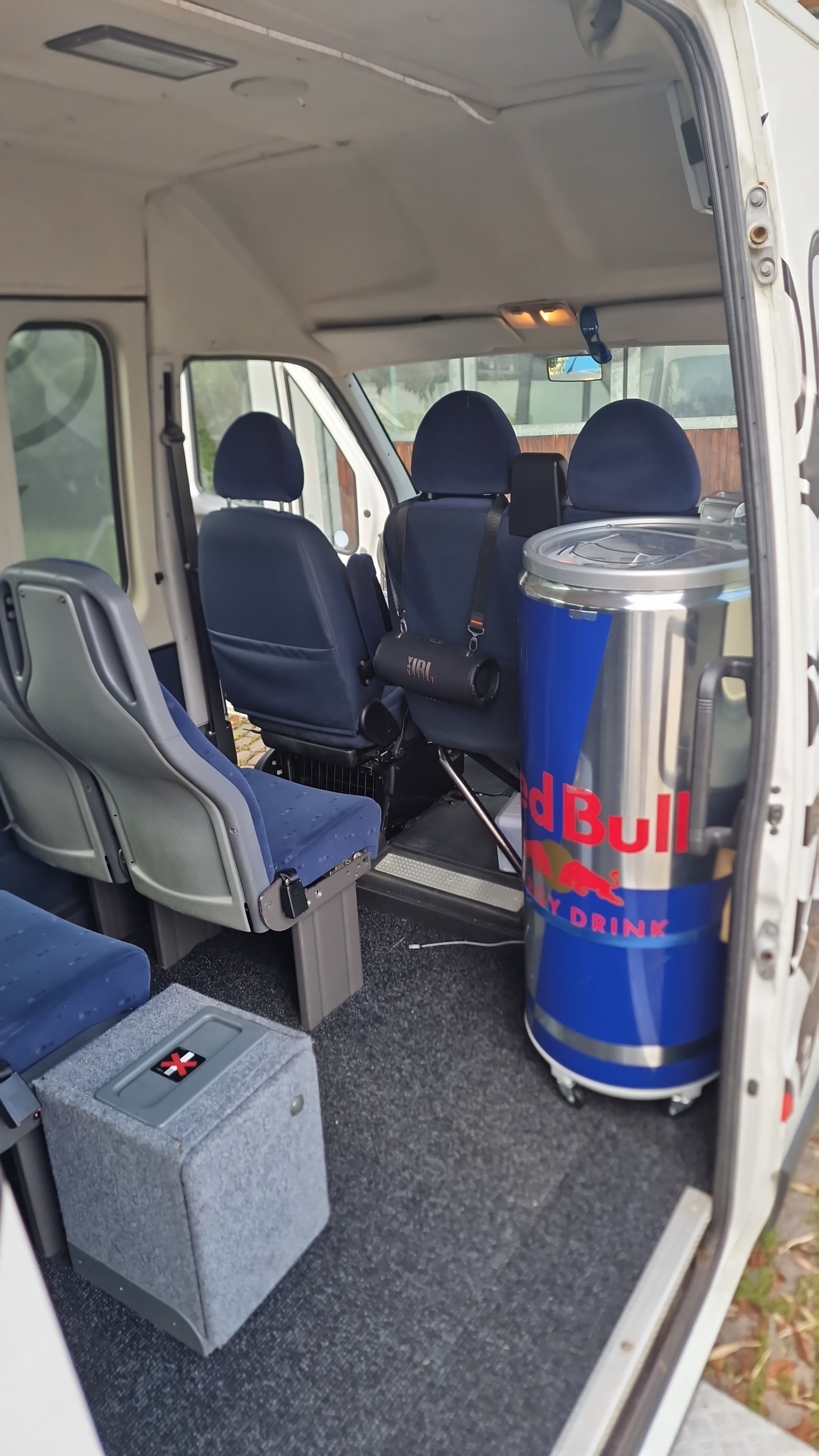 Unser Bus verügt über einen eingebauten Red Bull Kühlschrank. Dieser kann nach belieben aufgefüllt werden und kühles ist für die ganze Fahrt garantiert.